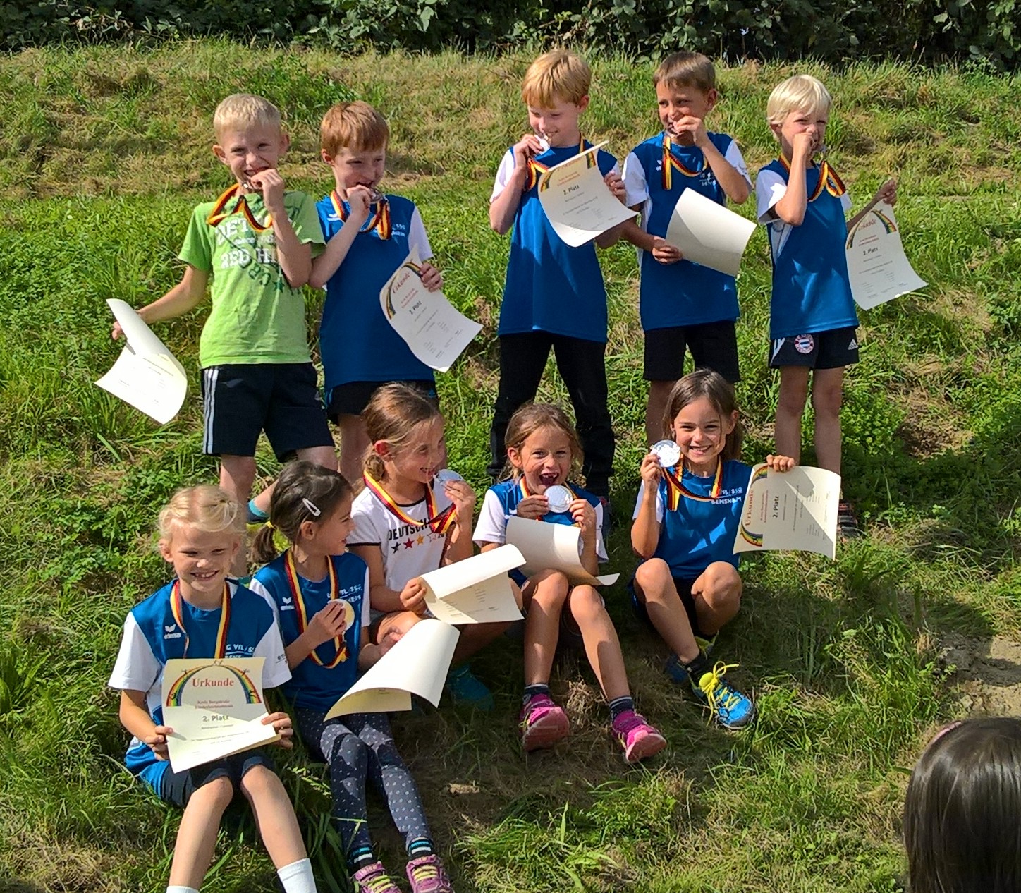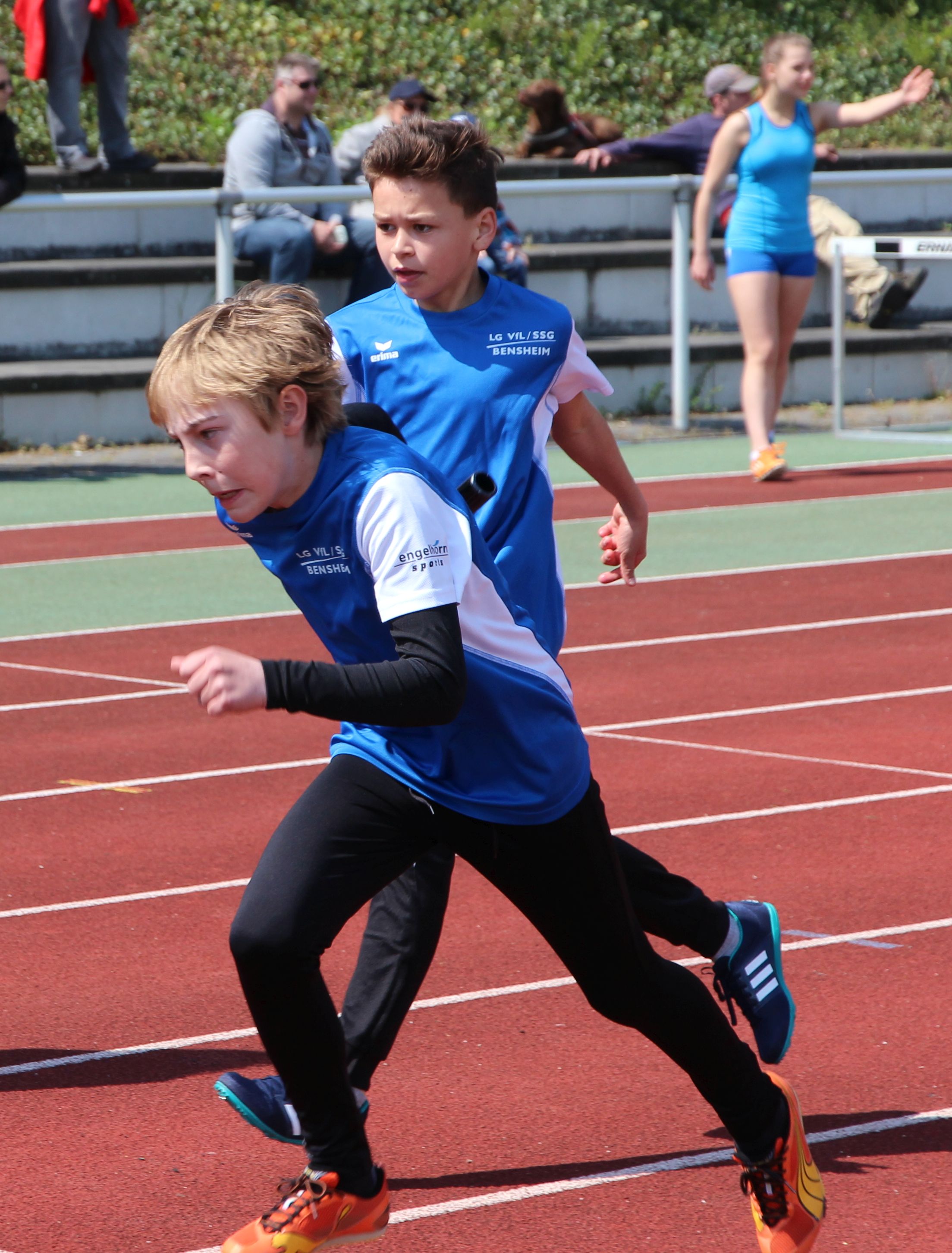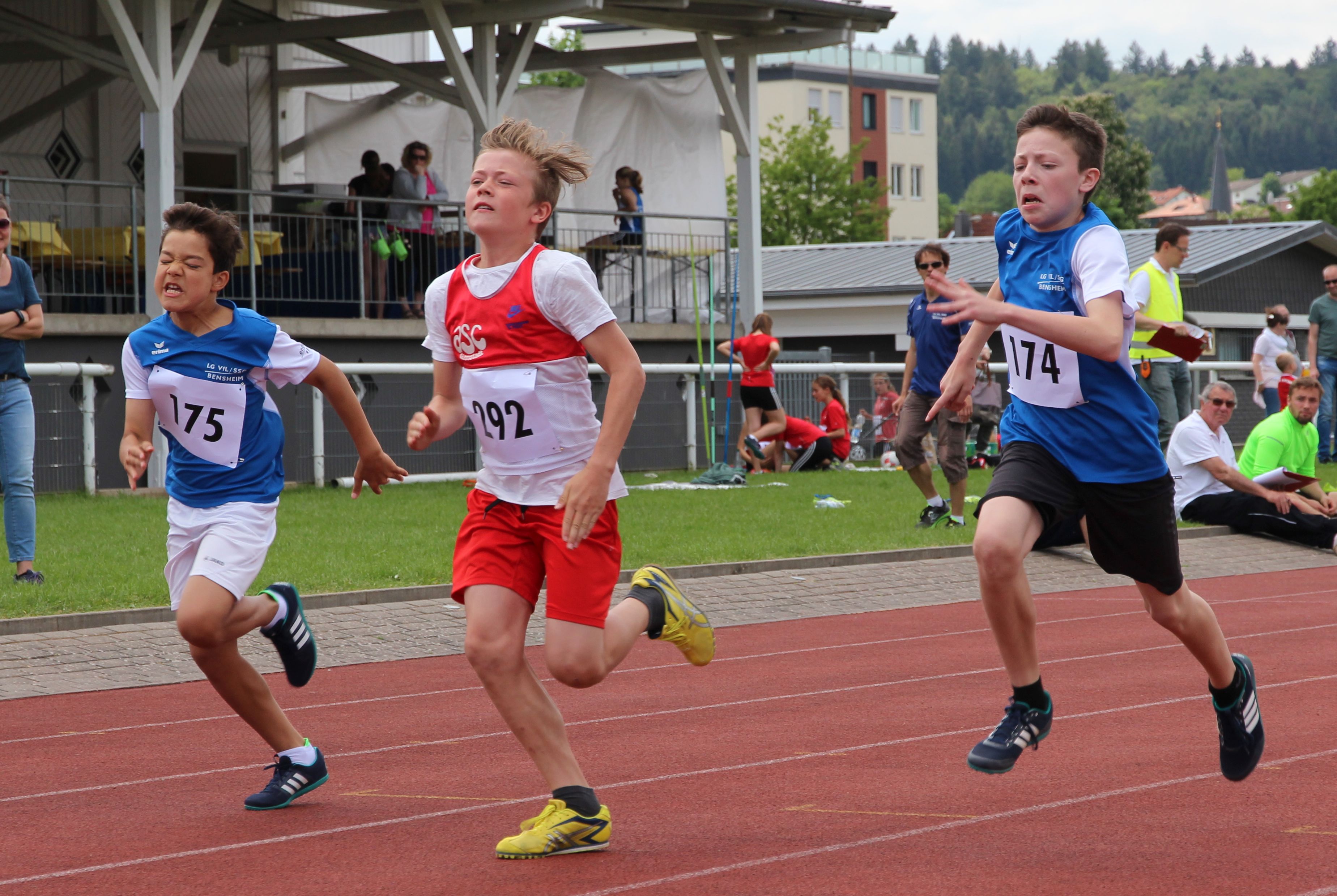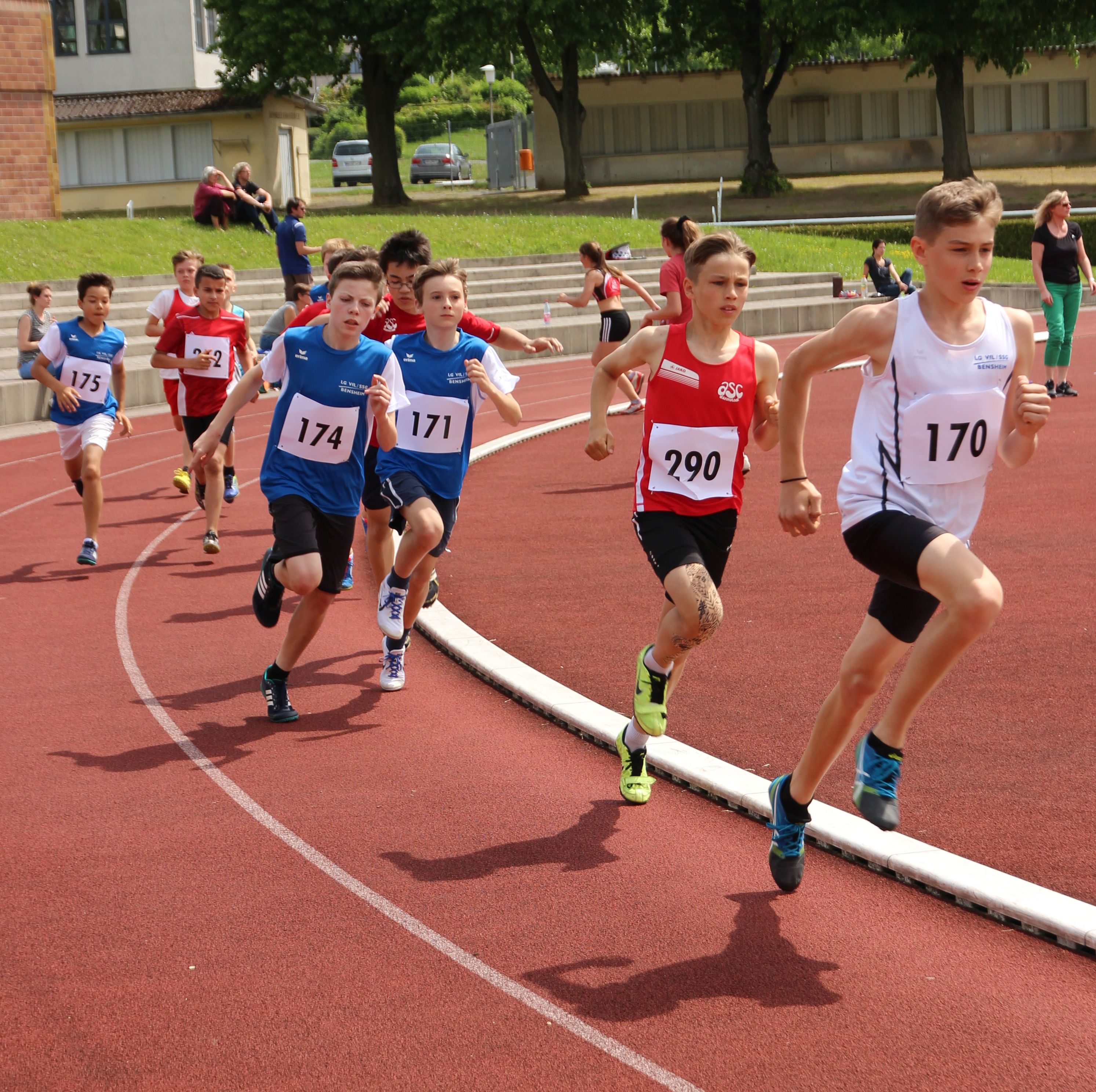 Auf Rang vier im Gruppe-1-Wettkampf platzierten sich die B-Schüler von VfL/SSG Bensheim mit 5808 Punkten. Für sie war es ein Handikap, den Hochsprungwettbewerb bei Regen austragenzu müssen. So brachten sie hier nur zweimal 1,24 Meter in die Wertung ein. Je dreimal in die Punktewertung kamen Felix Bonik und Moritz Brandt. Die Ergebnisse: 75 m: Felix Bonik: 10,4 Sek.; Moritz Brandt: 11,0 Sek.; Julius Schäfer: 11,1 Sek.; 1000 m: Maximilian Wilk: 3:25,1 Min. (pB); Johannes Henke: 3:28,6 Min.; Johannes Platten: 3:35,3 Min.; 60 m-Hürden: Moritz Brandt: 10,6 Sek. (pB); Felix Sonnabend: 11,3 Sek. (pB); Jannis Bremer: 12,0 Sek.; Weitsprung: Felix Bonik: 4,70 m (pB); Adrian Forstbach: 4,52 m (pB); Julius Schäfer: 4,36 m; Benedikt Becker: 3,94 m; Ballwurf: Moritz Brandt: 48,5 m (pB); Stefan Stehle: 41,5 m (pB); Felix Sonnabend: 40,0 m (pB); Maximilian Wilk: 28,0 m; Hochsprung: Benedikt Becker, Maximilian Wilk und Adrian Forstbach jeweils 1,24 m; 4 x 75 m 1. Staffel: Julius Schäfer, Felix Sonnabend, Adrian Forstbach, Felix Bonik: 42,1 Sek.; 2. Staffel: Johannes Platten, Jannis Bremer, Benedikt Becker, Stefan Stehle: 47,3 Sekunden.