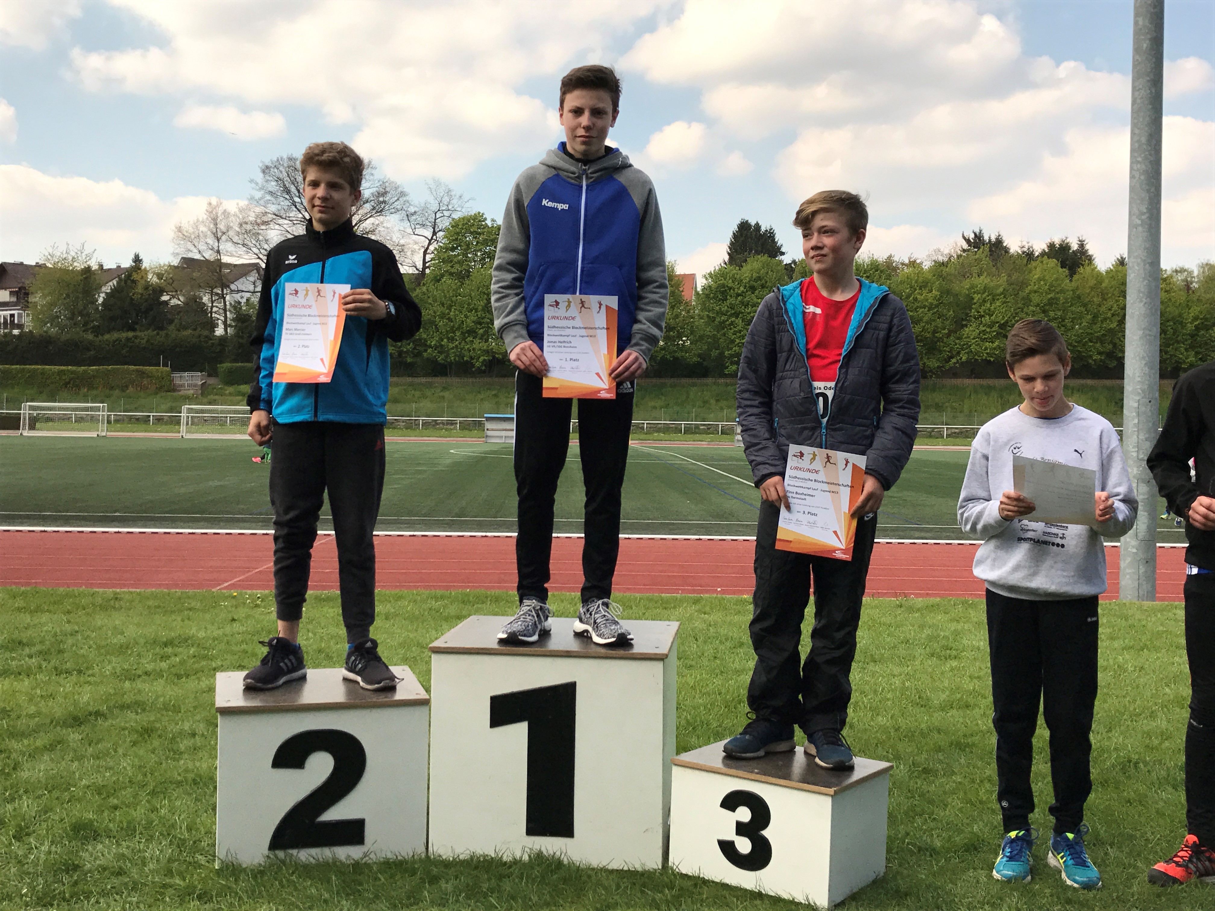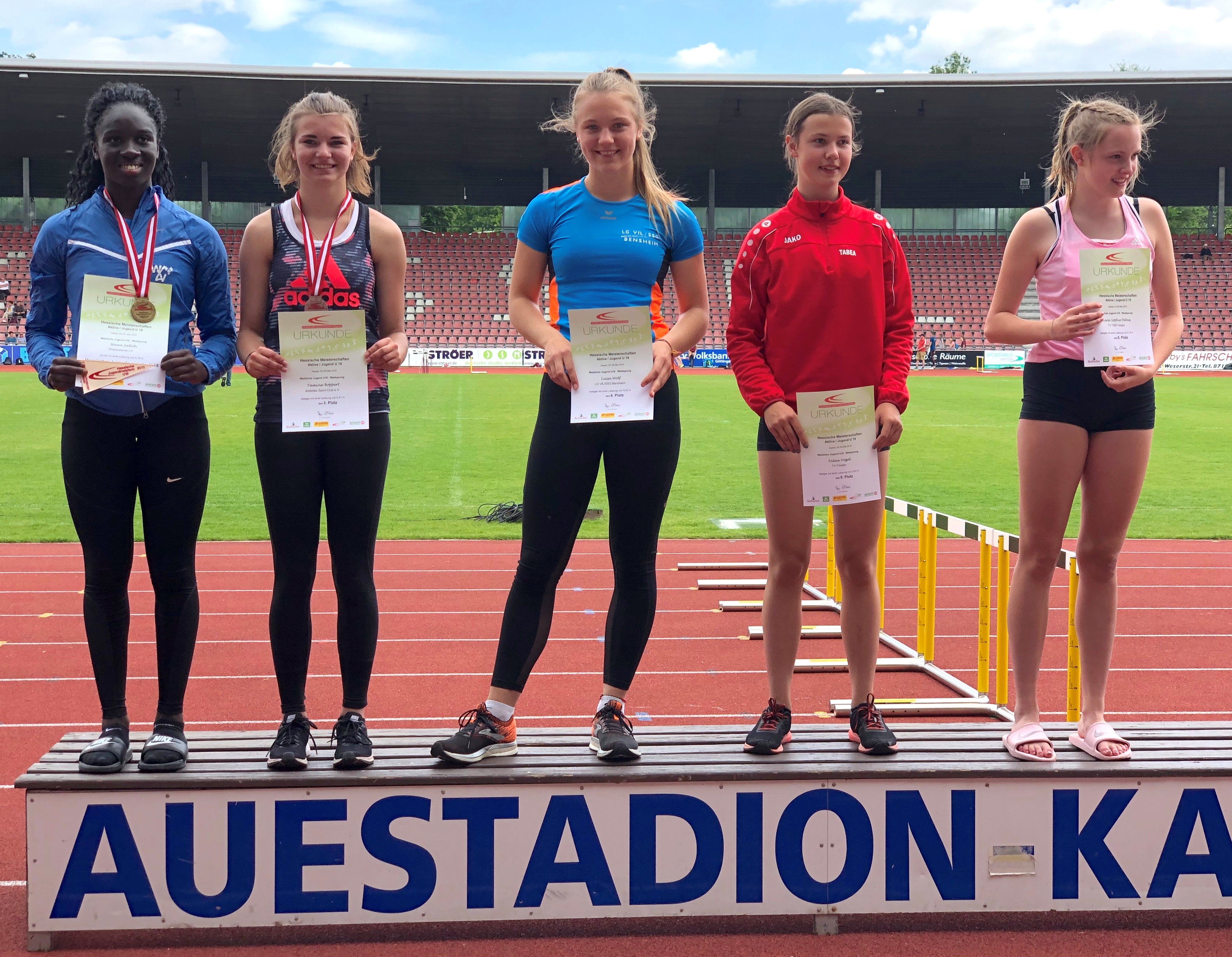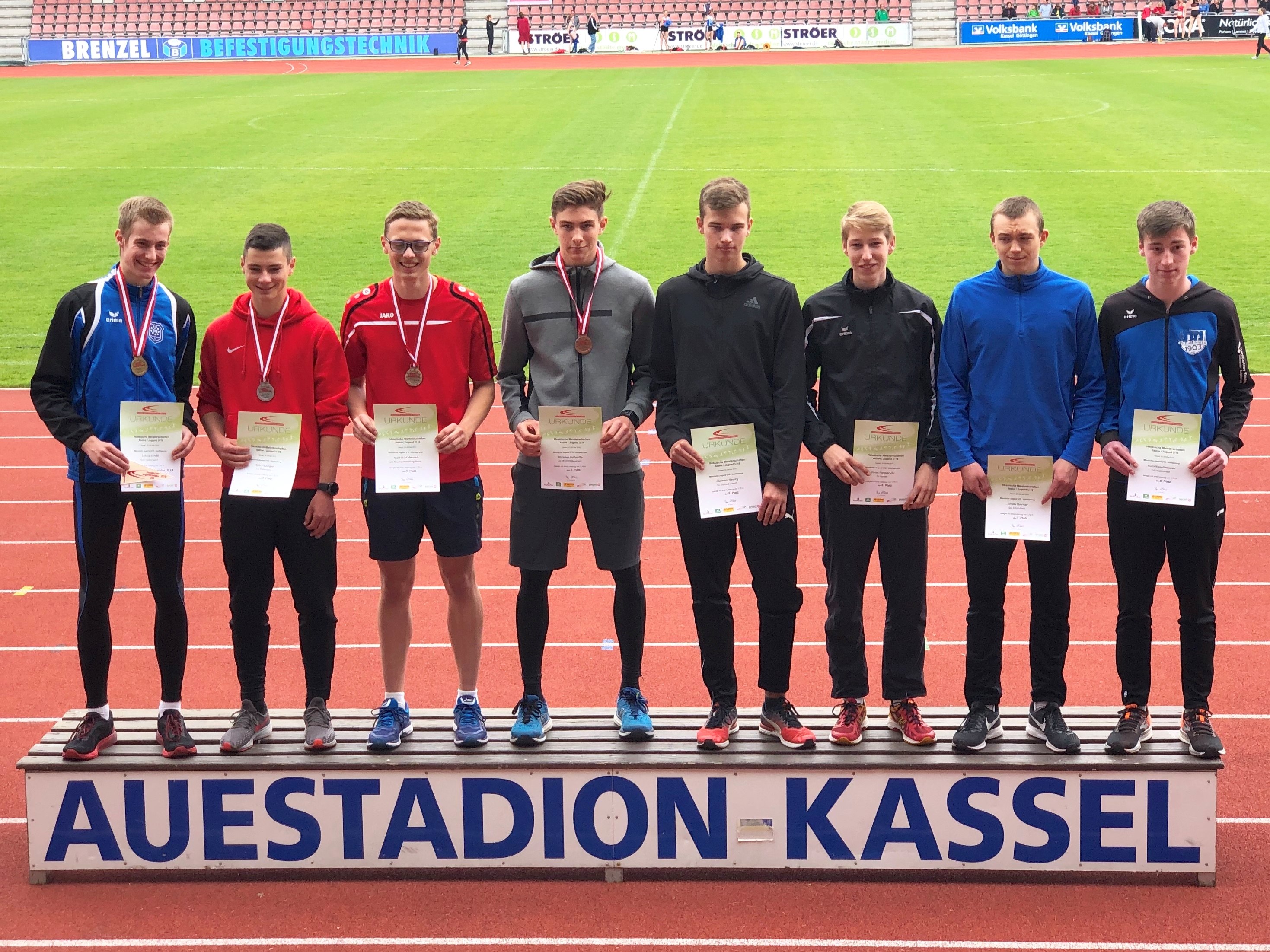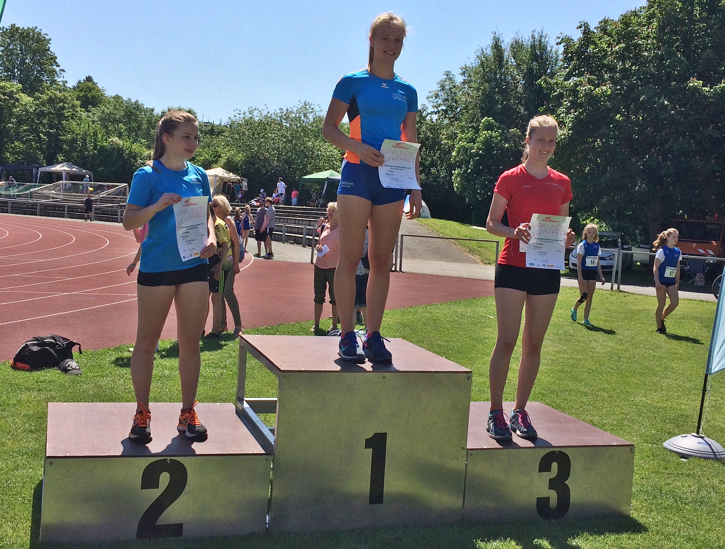 Zweimal Silber holte sich Benjamin Gang in der U 20, mit 1,85 Meter im Hochsprung und 5,93 Meter im Weitsprung. Sehr gute 1,47 Meter brachten Ann-Kathrin Steinhagen im Hochsprung der W 15 die Vizemeisterschaft. Über 100 Meter wurde sie in 13,57 Sekunden Dritte. Ebenfalls Rang drei erzielten in der AK M 14 Jonas Köber mit dem Speer (25,11 Meter) und Nick Schrettlinger über die 100 Meter in 12,93 Sekunden. Johannes Bitsch wusste in der AK M 13 mit Platz zwei im Weitsprung (4,48 Meter) sowie Rang drei in 10,72 Sekunden über 75 Meter zu gefallen. Einen Platz höher auf dem Podium kletterten über die 800 Meter Sebastian Tscheulin in der AK M 14 mit 2:26,18 Minuten und Lina Ross in der W13 mit 2:39,70 Minuten.