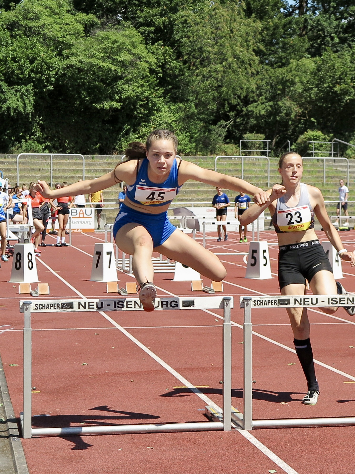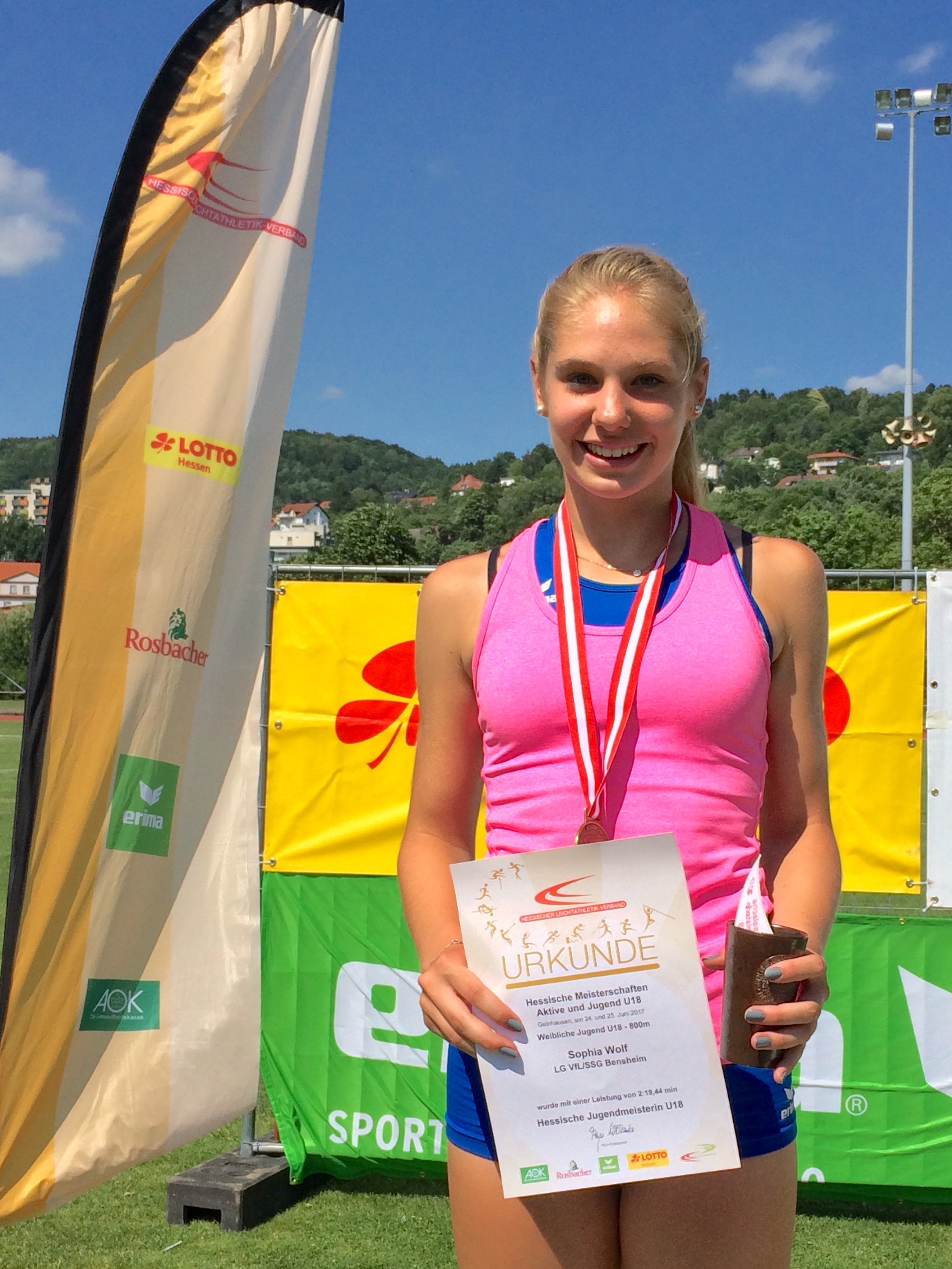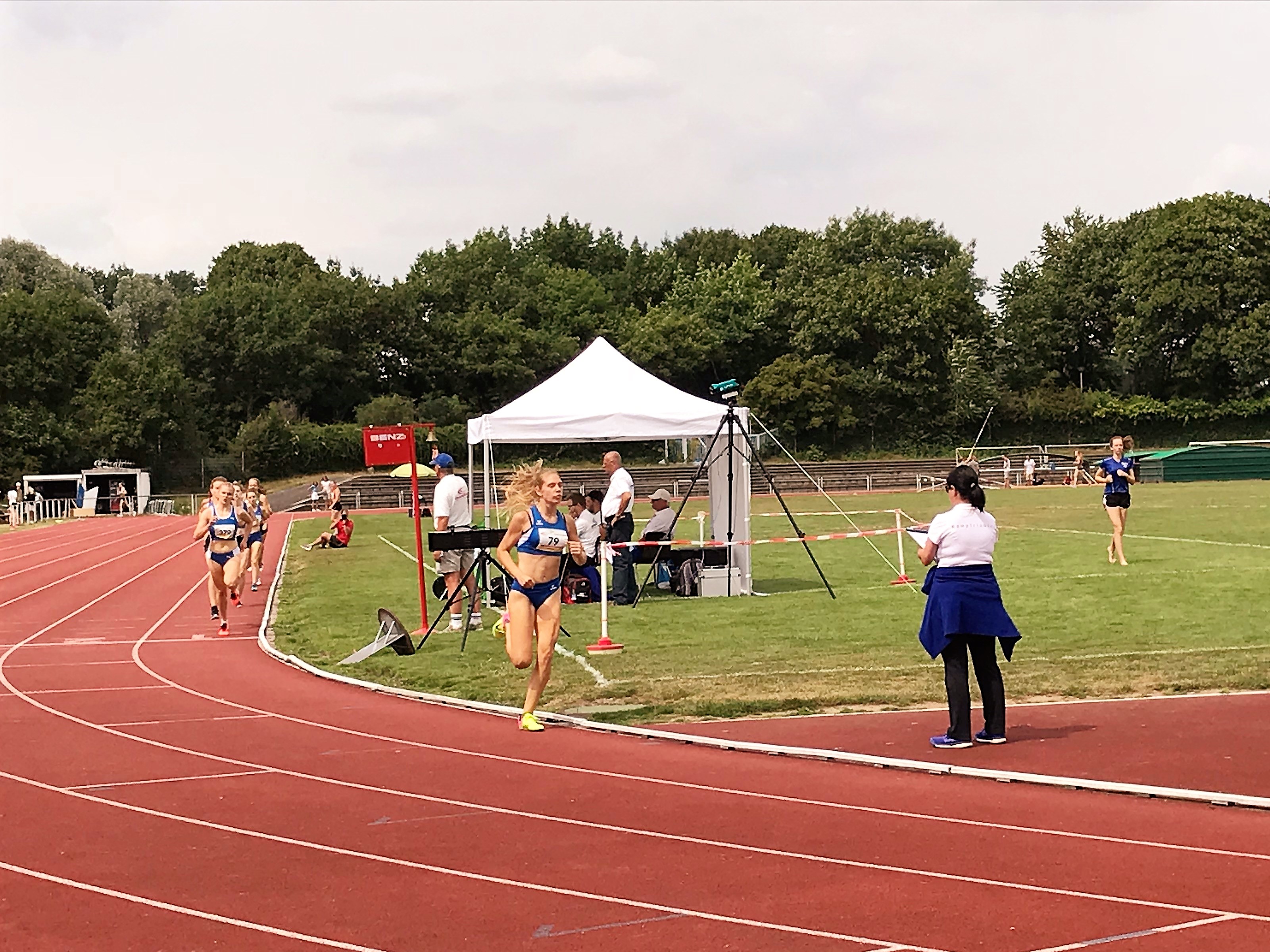 Für den zweiten Bensheimer Hessentitel sorgte Nele Harjes über 800 Meter bei der weiblichen Jugend U 18. In einem von Taktik geprägten Rennen war das Anfangstempo zunächst sehr moderat. Die favorisierte Frankfurterin Heba Tidjani versuchte nach 400 Metern die Flucht nach vorn, konnte sich aber nicht entscheidend absetzen. Nachdem die kurz aufgegangene Lücke wieder geschlossen war, forcierte Nele 150 Meter vor dem Ziel das Tempo, setzte sich an die Spitze des Feldes und lief in einem starken Finish in 2:22,90 Minuten zu Gold. Silber holte sich die zweite Frankfurterin im Feld, Hannah Lösel, in 2:23,57 Minuten vor Nele Löwe (LG Bad Soden/Neuenhain) in 2:24,02 Minuten.