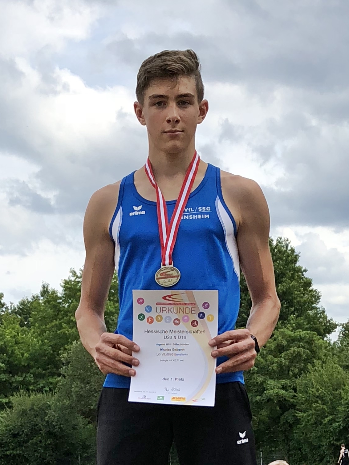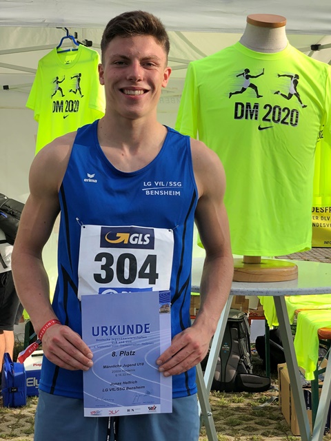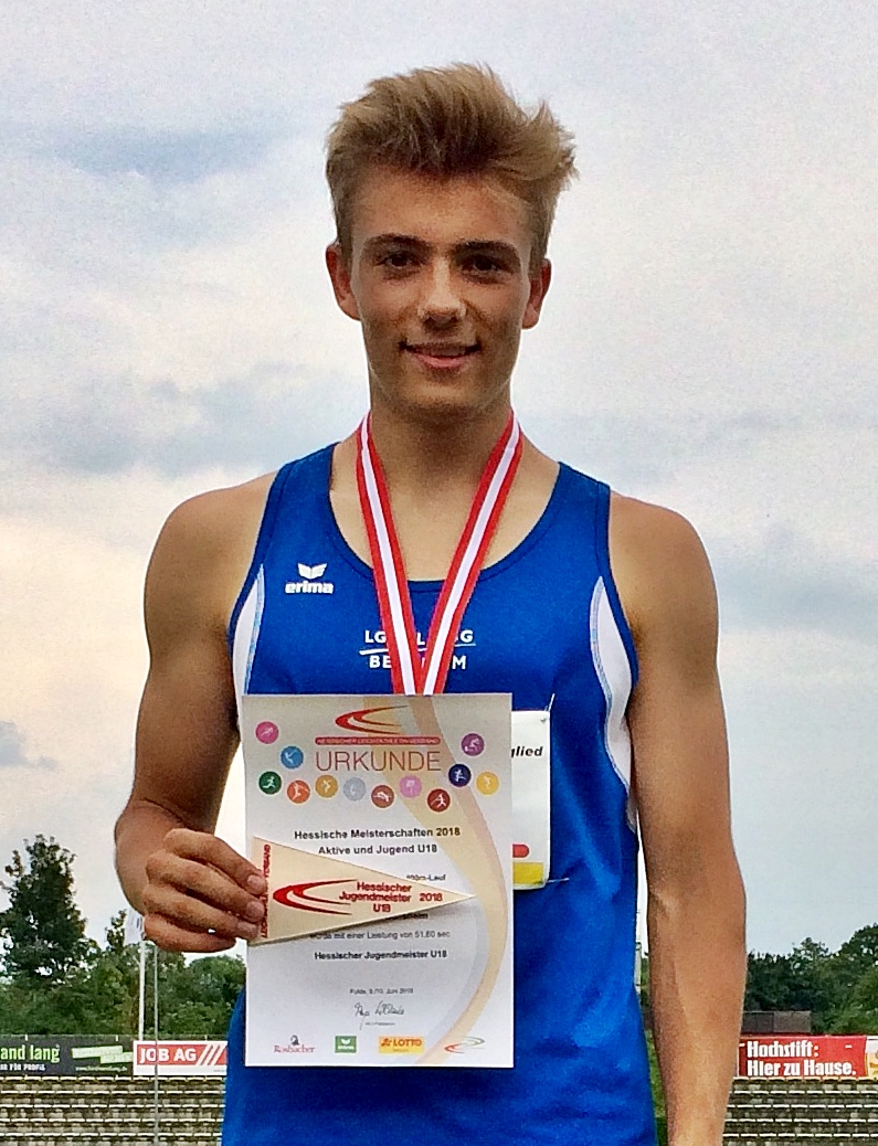 In der AK U 20 bestätigte Hochspringer Nicolas Gelbarth seine starke Form und übersprang bereits zum zweiten Mal in dieser Saison die Marke von 2,00 Meter. Damit wurde er hessischer Vizemeister, hinter dem Ausnahmespringer Maximilian Grün aus Darmstadt, der mit hervorragenden 2,09 Meter Gold holte.