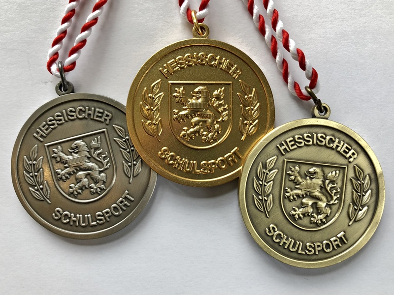 Zur mit Spannung erwarteten Siegehrung versammelten sich abschließend alle acht Mannschaften auf dem Hauptfeld. Bei den Ehrungen für die Plätze acht bis fünf war man schon mal nicht aufgerufen worden. Dann folgte die Bekanntgabe, dass es wegen Punktgleichheit zwei Bronzemedaillen geben würde. Dritte wurden, mit jeweils 21 Ranglistenpunkten, das Goethe-Gymnasium Kassel und … die Carl-von-Weinberg-Schule Frankfurt. Mit elf Ranglistenpunkte wurde das AKG hessischer Vizemeister und hatte dabei am Ende sogar einen relativ großen Vorsprung auf Rang drei. Entsprechend groß war die Freude der AKGler bei der Überreichung der Silbermedaillen. Und auch die Trainer, Markus Forster und Ines Harjes, zeigten sich begeistert von ihrer Mannschaft: „Mit der hessischen Vizemeisterschaft hat das Team das Maximum herausgeholt. Das war ein sehr überzeugender Auftritt.“ Landessieger Hessen wurde die Georg-Büchner-Schule aus Darmstadt mit sieben Ranglistenpunkten. Damit stellt die Region Südhessen Platz eins und zwei im Land.