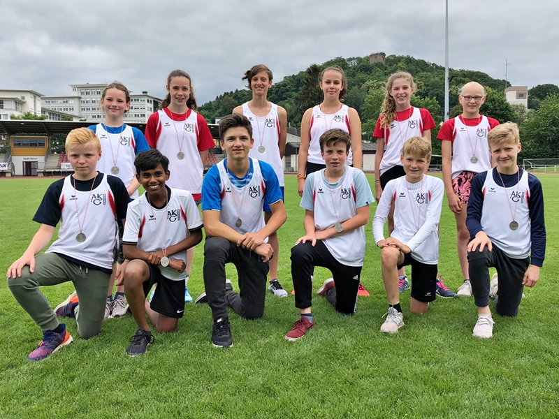 Und wieder waren von den zwölf Teammitgliedern – je sechs Mädchen und Jungen – fünf Disziplinen, 50-Meter-Sprint, Weitsprung, Ballwurf, Hindernis-Pendelstaffel und ein Zehn-Minuten-Lauf zu absolvieren. Die jeweils fünf besten Ergebnisse bei Mädchen und Jungen gehen dabei in die Gesamtwertung ein. Bereits bei der ersten Disziplin, dem Sprint, setzte sich die junge AKG-Mannschaft glänzend in Szene und untermauerte ihren Anspruch auf eine Medaille. Auch beim Weitsprung und dem Ballwurf überzeugte das Team mit großer mannschaftlicher Geschlossenheit. Bei der Hindernis-Staffel konnte der direkte Gegner, die CvW-Schule aus Frankfurt, in einem spannenden Rennen und mit sicheren Wechseln knapp geschlagen werden.