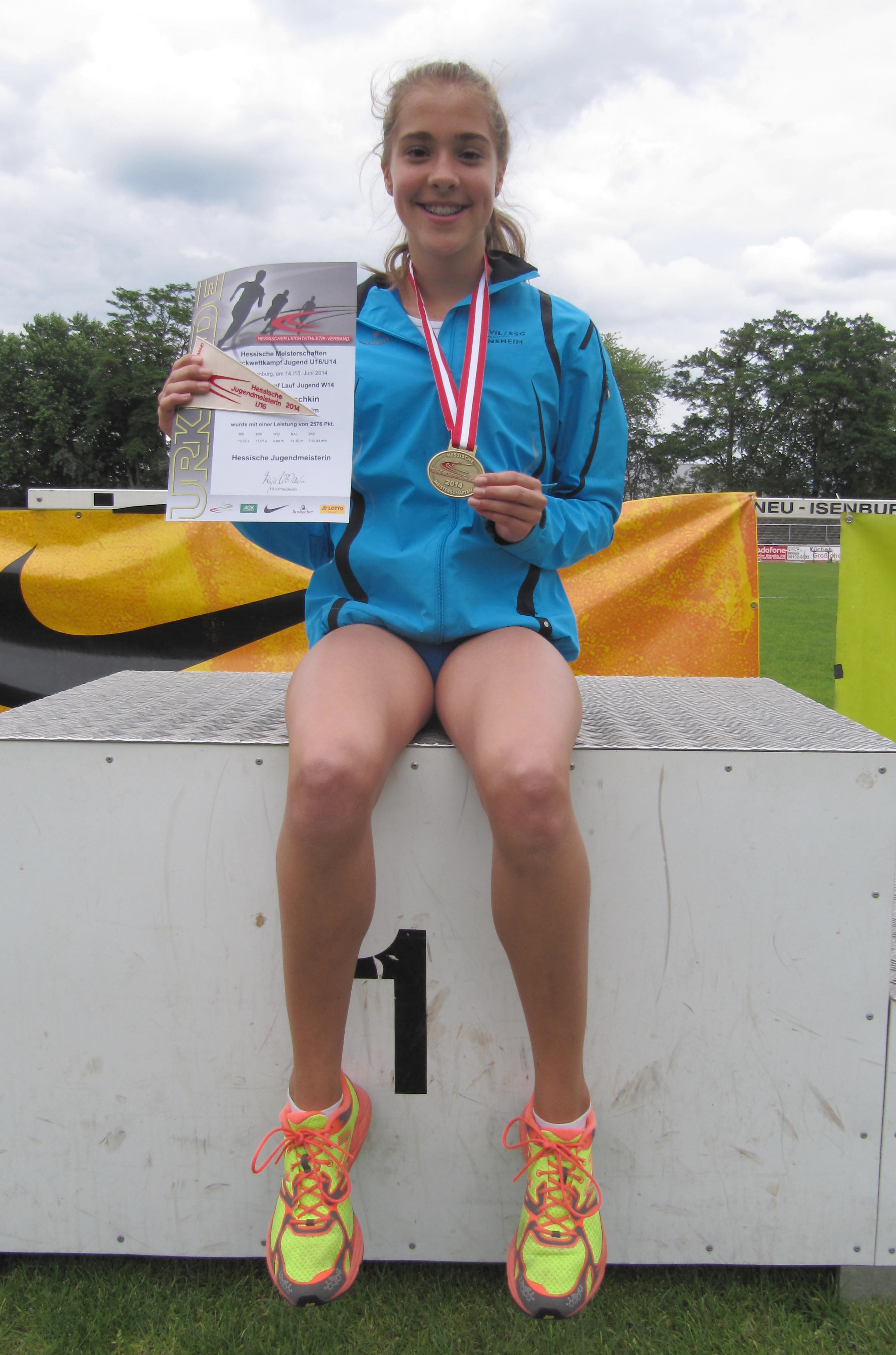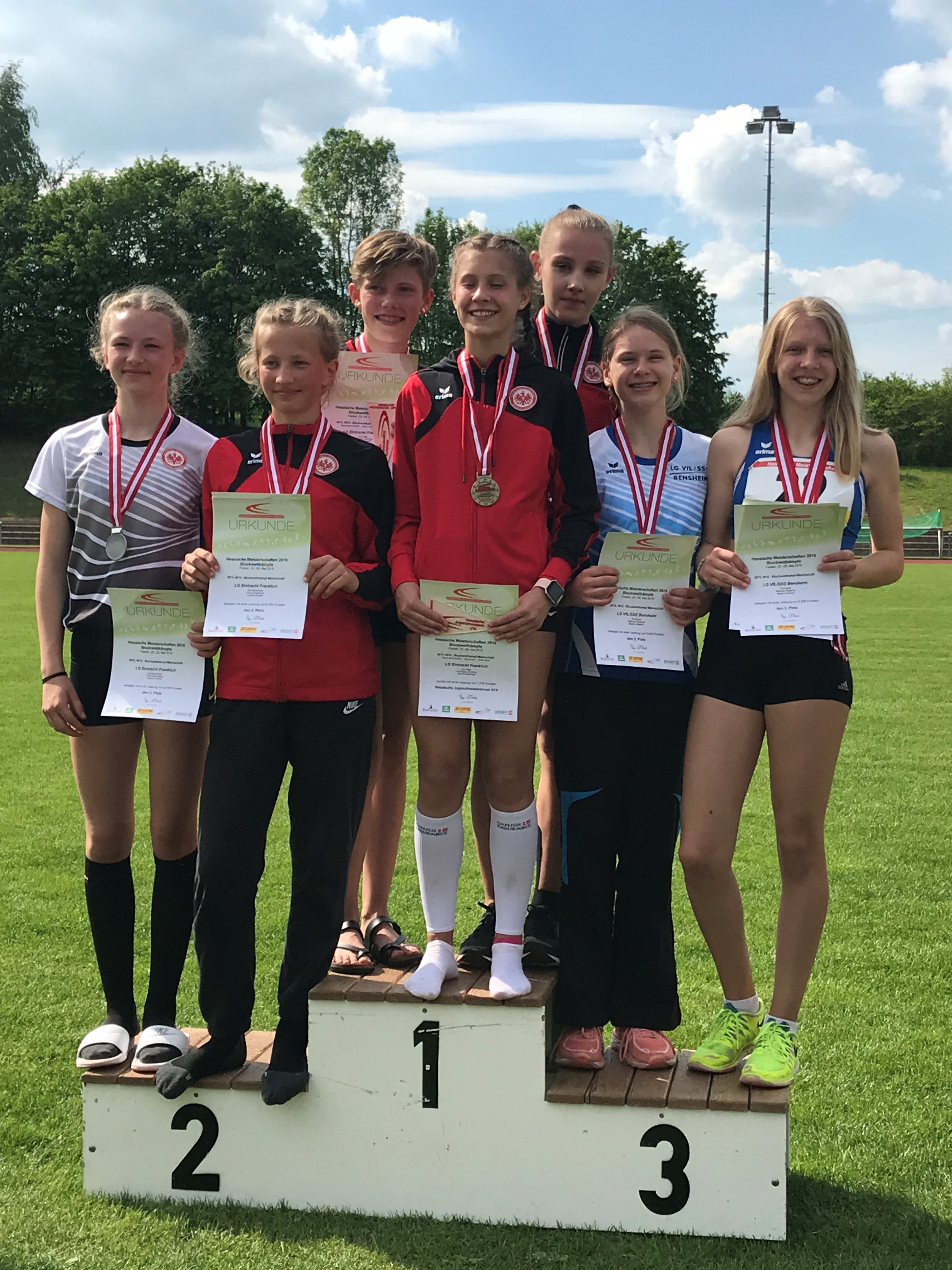 Am zweiten Tag glänzte Lina Harjes im Block Lauf der W12. Dabei stellte sie mit starken 4,70 Meter im Weitsprung, 2:36,56 Minuten im abschließenden 800-Meter-Lauf sowie insgesamt 2.391 Punkten in der Mehrkampfwertung gleich drei neue LG-Rekorde auf! Vereinskameradin Anne Vetter kam im selben Block mit 2.193 Punkten auf einen guten sechsten Platz. Lina Ross komplettierte im Block Lauf der W13 mit 2.226 Punkten und Rang sieben den hervorragenden Gesamteindruck. Das Warten auf die Teamwertung war hier mehr als ungläubig denn als spannend zu bezeichnen. Denn mit 6.810 Punkten gewannen die LG-Mädchen mit satten 233 Punkten Vorsprung die hessische Mannschaftsmeisterschaft in der weiblichen Jugend U14 und damit das vierte Gold der Meisterschaften für die LG VfL/SSG Bensheim.Nick Schrettlinger wurde im Block Wurf der M14 mit 2.198 Punkten Sechster. Jonas Köber musste seinen Wettkampf im Block Sprint/Sprung der M14 nach drei Disziplinen verletzungsbedingt abbrechen.