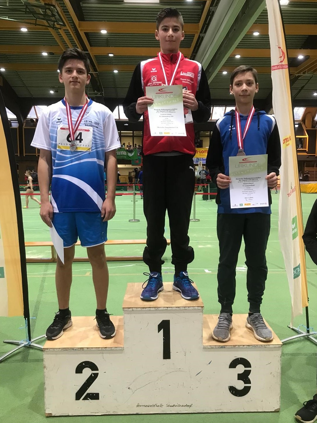 Ebenfalls in guter Form über die 60 Meter präsentierte sich David Hügel. Im Vorlauf der U 20-Hessenmeisterschaften steigerte sich der LGB-Athlet auf 7,29 Sekunden, was ihm den Einzug ins Finale brachte. Dort bestätigte er in 7,28 Sekunden seine Vorlaufzeit und belegte einen sehr guten fünften Rang. Seinen ersten Start bei einer Landesmeisterschaft überhaupt absolvierte Nick Schrettlinger. Bei den Titelkämpfen der AK U 16 qualifizierte er sich mit 8,19 Sekunden auf Anhieb für das Finale über die 60 Meter der M 14. Dort wurde er in 8,29 Sekunden Siebter. Nicht ganz zufrieden mit ihren Auftritten über die kurze Sprint-Distanz waren Benjamin Gang und Marlena Bestian. Benjamin blieb bei der U 20 nach einem verpatzten Start in 7,65 Sekunden ebenso deutlich unter seinen Möglichkeiten wie Marlena mit 8,71 Sekunden in der AK U 18.