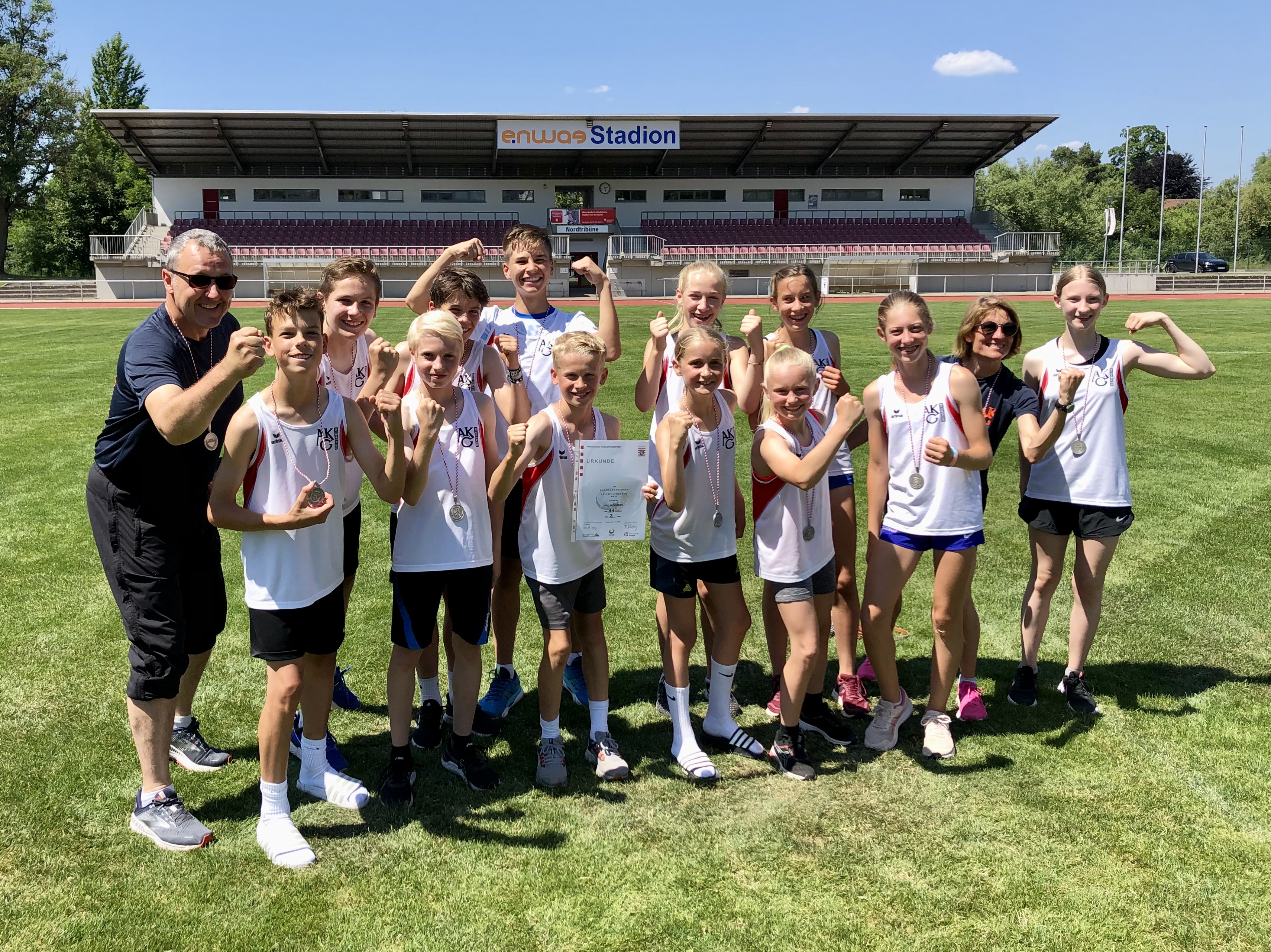 Zum hessischen Landesfinale, der Hessenmeisterschaft für Schulmannschaften, waren nun jeweils die beiden besten Teams der vier hessischen Regionen Nord, Mitte, Rhein-Main und Süd ins Enwag-Stadion nach Wetzlar eigeladen. Neben der GBS Darmstadt und dem AKG Bensheim starteten auch die Rhenanus-Schule Bad-Soden-Allendorf, das Goethe-Gymnasium Kassel, die Singbergschule Wölfersheim, die Liebigschule Gießen, die Carl-von-Weinberg-Schule Frankfurt sowie das Grimmelshausen-Gymnasium Gelnhausen, quasi das who is who der hessischen Schul-Leichtathletik.