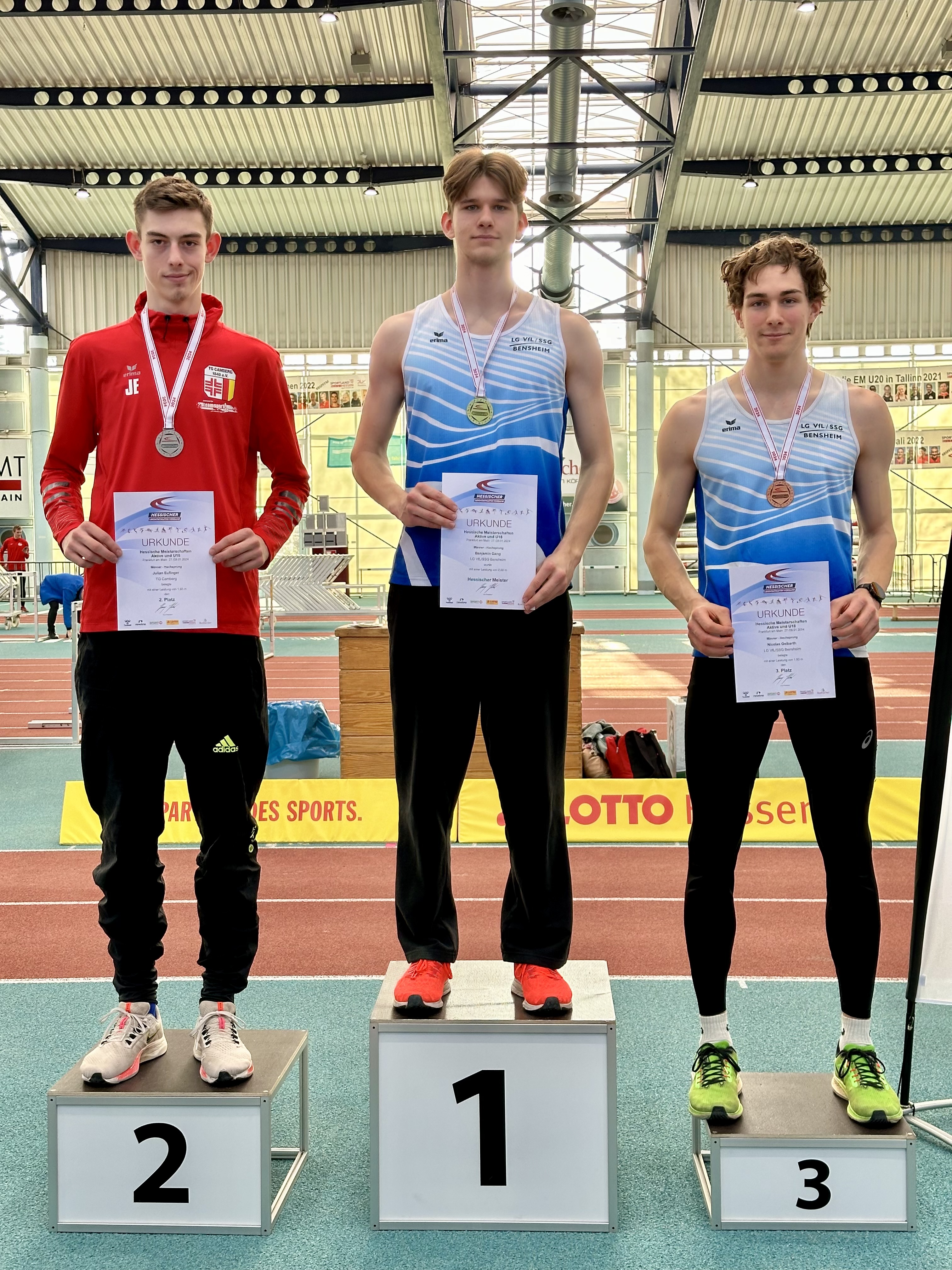 Für den ersten Paukenschlag sorgte Benjamin Gang im Hochsprung der Männer. In einem tollen Wettkampf steigerte er seine Freiluft-Bestleitung aus dem vergangenen Jahr gleich um vier Zentimeter, auf ausgezeichnete 2,00 Meter und holte sich überraschend die Goldmedaille. Trainingskollege Nicolas Gelbarth blieb mit übersprungenen 1,93 Meter hinter den eigenen Erwartungen zurück und gewann Bronze, höhengleich mit dem Zweitplatzierten Julian Eufinger (TG Camberg), der einen Fehlversuch weniger vorzuweisen hatte. Favorit Maximilian Grün vom ASC Darmstadt kam nach Trainingsrückstand nur auf 1,89 Meter und wurde Vierter.