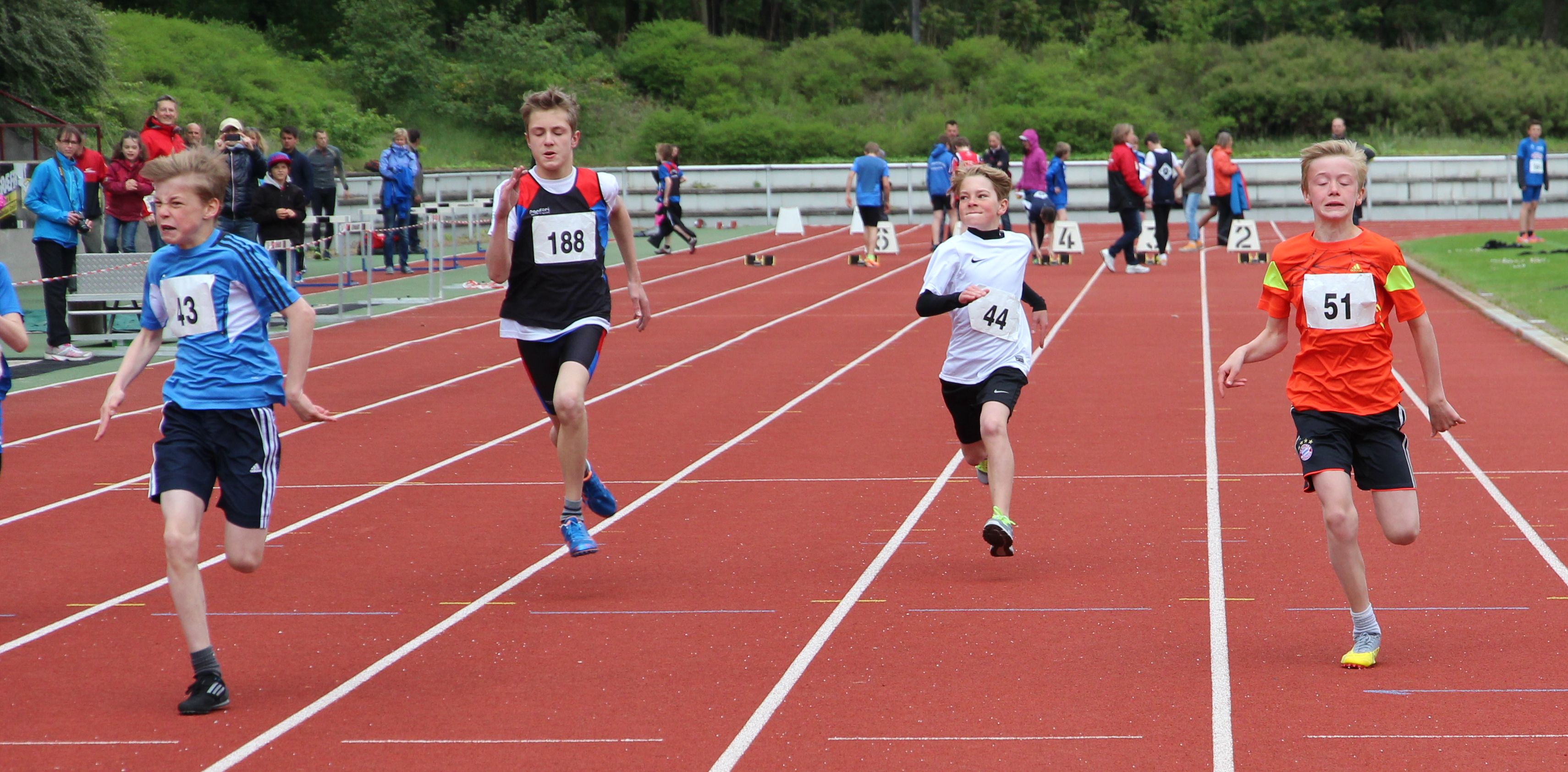 Als bester B-Schüler der Klasse M 12 platzierte sich Tano Marth im Block Lauf (75 m: 11,54 Sek.; 80 m-Hürden: 11,21 Sek.; Weitsprung: 3,86 m; Ballwerfen: 41,5 m; 1000 m: 3:22,21 Min.) mit 1971 Punkten auf Rang sieben. Die weiteren Ergebnisse: B-Schülerinnen W 13: Block Sprint/Sprung: 12 .Kathrin Stiehl: 2384 Punkte; 47. Sarah Krocker: 2036 Punkte; 58. Eva Heinecker: 1957 Punkte. Block Lauf: 19. Sabine Knippel: 2086 Punkte) W 12: 38. Nina Gorzawski: 1910 Punkte; 52. Verena Schumacher: 1668 Punkte; Mannschaftswertung: 11.Platz: 10940 Punkte. B-Schüler M 13: Block Sprint/Sprung: 13. Felix Bonik: 2057 Punkte; 25. Felix Sonnabend: 1855 Punkte; 30. Adrian Forstbach: 1820 Punkte; 42. Maximilian Wilk: 1609 Punkte. M 12: Block Sprint/Sprung:11. Julius Schäfer: 1812 Punkte; 13. Jannis Bremer: 1802 Punkte. Block Lauf 20. Johannes Platten: 1724 Punkte, Mannschaftswertung: 11.Platz: 9515 Punkte.