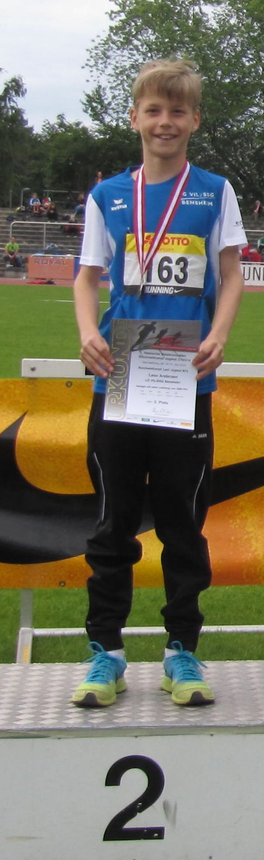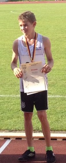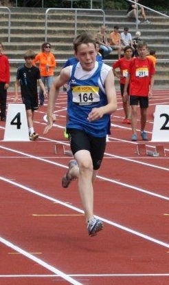 Mit der herausragenden Laufleistung von 6:40,0 Minuten über 2000 Meter nahm Kolja Breuer im Block Lauf (100 m: 13,10 Sek.; 80 m-Hürden: 12,72 Sek.; Weitsprung: 5,65 m; Ballwerfen: 46,0 m; 2000 m) dem führenden Marc-John Dombrowski (LG Eintracht Frankfurt; 2506 Punkte) 38,5 Sekunden ab und katapultierte sich mit 2490 Punkten auf Rang zwei. Am Ende fehlten nur 16 Punkte zum Sieg. Nur 81 Punkte zur DM-Qualifikation fehlten am Ende Gesine Richter im Block Sprint/Sprung (100 m: 13,50 Sek.; 80 m-Hürden: 12,60 Sek.; Weitsprung: 4,46 m; Hochsprung: 1,48 m; Speerwerfen: 23,58 m) bei den A-Schülerinnen der Klasse W 15. Mit 2494 Punkte belegte sie Rang sechs. "Schade, dass sie im Weistprung patzte und den Balken nichttraf, sonst wäre auch sie mit nach Rhede gefahren," zeigt sich Trainer Markus Forster dennoch zufrieden über die tollen Ergebnisse seinerSchützlinge.