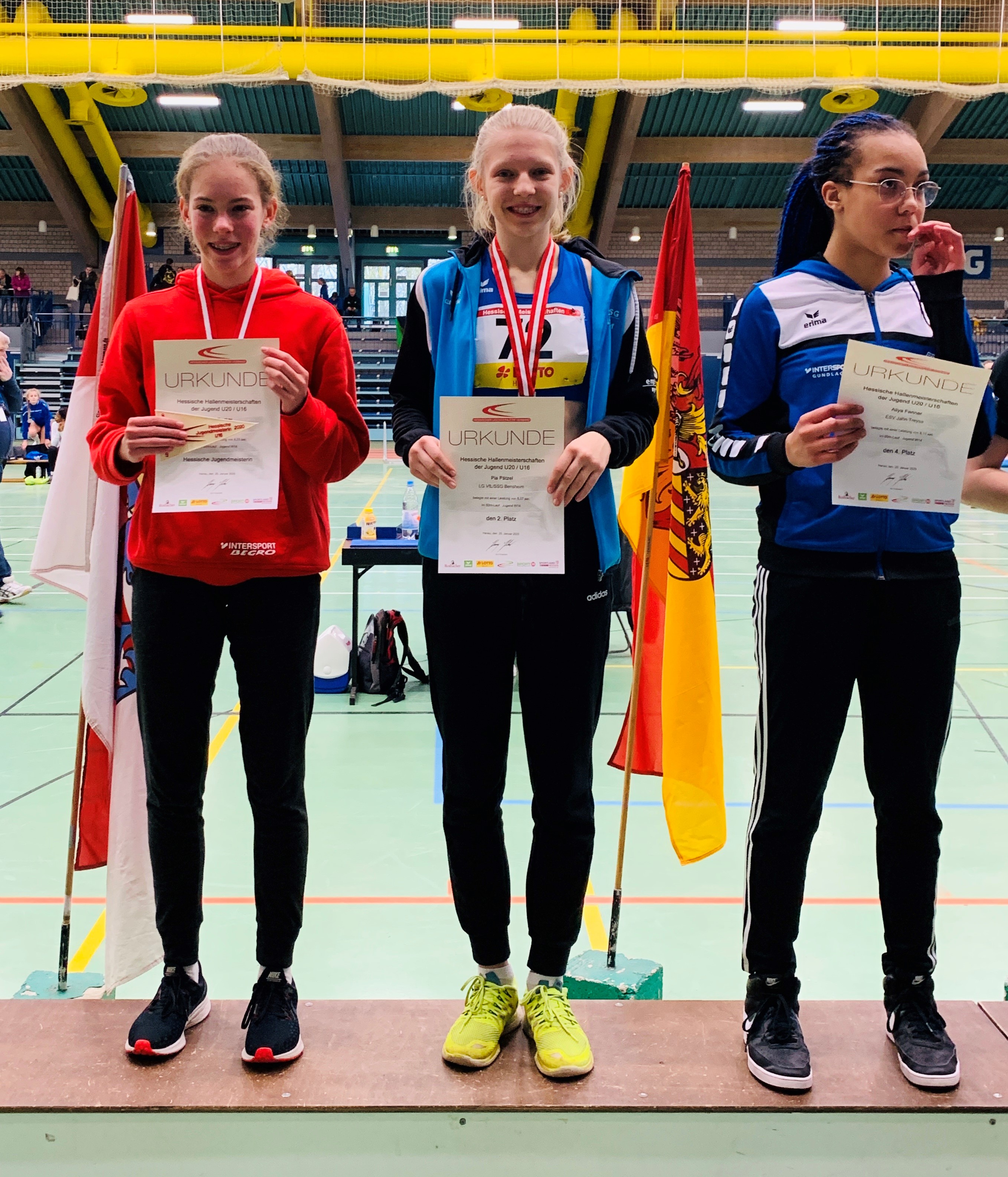 Ein Ausrufezeichen setzte dabei U 18-Athletin Pia Pätzel. Die dem jüngeren Jahrgang 2006 angehörende D-Kader-Athletin des HLV überzeugte gleich beim ersten Hallen-Auftritt, den hessischen Meisterschaften in Frankfurt-Kalbach. Bei ihrem souveränen Sieg im Vorlauf blieb sie in 7,87 Sekunden erstmals unter der Acht-Sekunden-Marke. Doch damit nicht genug. Im Finale gelang ihr eine weitere Steigerung auf 7,81 Sekunden und der Gewinn der Bronzemedaille. Auch bei den Titelkämpfen der höheren Altersklasse (AK) U 20 in Hanau konnte Pia überzeugen. Mit 7,85 Sekunden erreichte sie auch hier das Finale, in dem sie mit 7,91 Sekunden Rang fünf belegte. Den Abschluss ihrer Hallensaison bildeten die süddeutschen Hallenmeisterschaften der U 18, wieder in Kalbach. Mit 7,89 Sekunden im Vorlauf und 7,86 Sekunden im Finale gelang Pia eine Bestätigung ihrer zuvor gelaufenen Zeiten und ihrer straken Form. „Beim Start im Endlauf habe ich mich nicht ganz so gut getroffen, sonst wäre vielleicht noch etwas mehr als der fünfte Platz drin gewesen“, bilanzierte Pia ihren Auftritt im Finale.